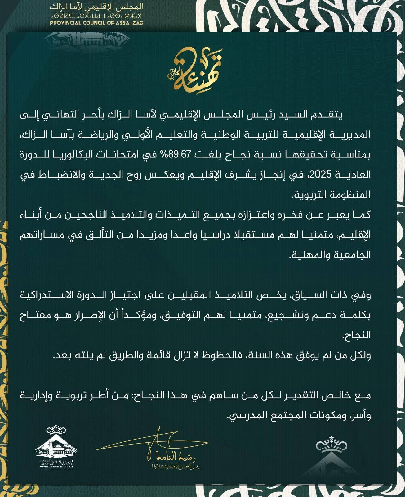 وفگدني أراهم ذو الاعلانيين سبگهم أعلان يهني فيه رايس المجلس الاقليمي لأسا نيابة التعليم وعموم التلاميذ الناجحين في اقليم أسا ويتمنى لهم التوفيق والسداد… ويدعي أملي مع ذوك المستدركين… يوگي بعد..