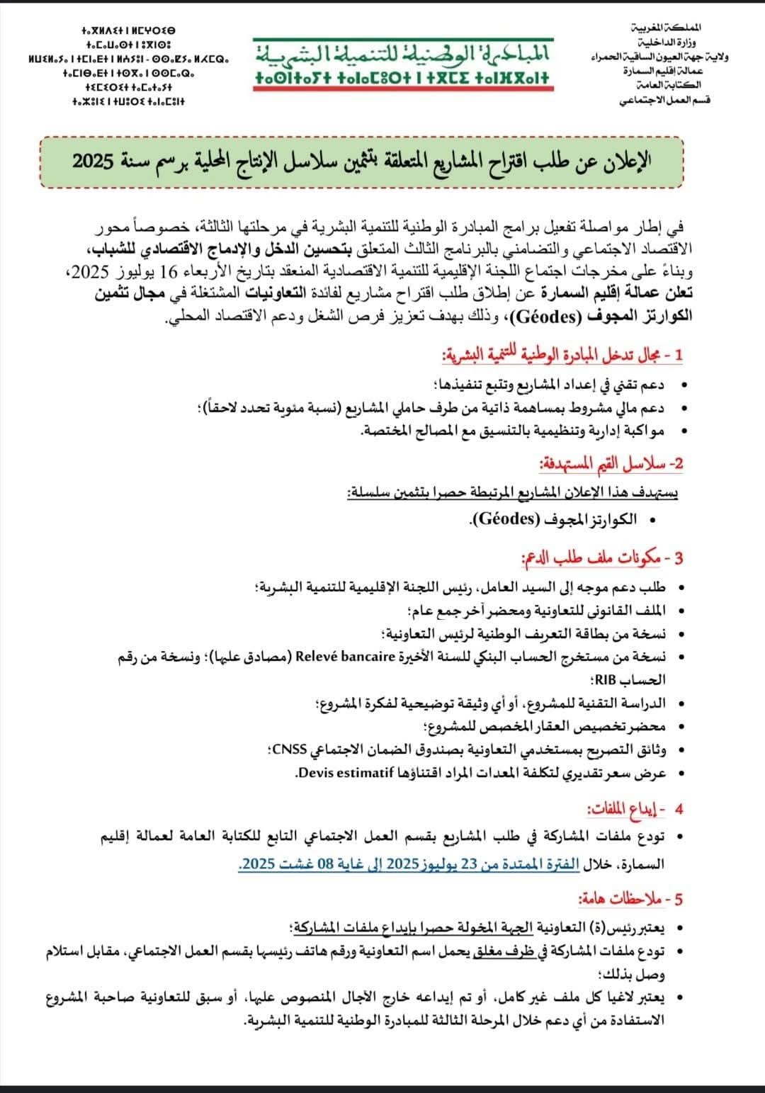 📢 إعلان هام من عمالة السمارة. شؤون محلية آخر تحديث يوليو 29, 2025 شارك أعلنت المصالح المختصة بإقليم السمارة عن فتح باب طلب اقتراح المشاريع المتعلقة بتثمين سلاسل الإنتاج المحلية برسم سنة 2025، وذلك في إطار دعم المبادرات المحلية وتشجيع الاقتصاد الاجتماعي والتضامني بالإقليم 👇 شارك FacebookTwitterWhatsAppPinterestالبريد الإلكترونيطباعة