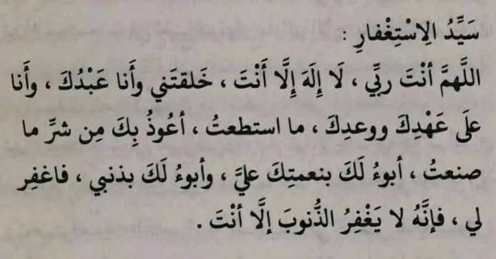 “سَيِّدُ الِاسْتِغْفَارِ أَنْ تَقُولَ: اللَّهُمَّ أَنْتَ رَبِّي، لَا إِلَهَ إِلَّا أَنْتَ، خَلَقْتَنِي وَأَنَا عَبْدُكَ، وَأَنَا عَلَى عَهْدِكَ وَوَعْدِكَ مَا اسْتَطَعْتُ، أَعُوذُ بِكَ مِنْ شَرِّ مَا صَنَعْتُ، أَبُوءُ لَكَ بِنِعْمَتِكَ عَلَيَّ، وَأَبُوءُ لَكَ بِذَنْبِي فَاغْفِرْ لِي فَإِنَّهُ لَا يَغْفِرُ الذُّنُوبَ إِلَّا أَنْتَ،