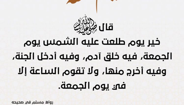 “خيرُ يومٍ طلعتْ عليهِ الشمسُ يومُ الجمعةِ؛ فيهِ خُلِقَ آدمُ، وفيهِ أُدخلَ الجنةَ، وفيهِ أُخرجَ منها”