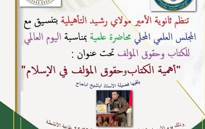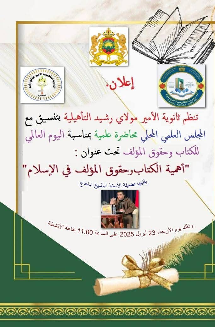 بمناسبة اليوم العالمي للكتاب وحقوق المؤلف. وتنزيلا منها لبرامجها العلمية والثقافية، تنظم ثانوية الأمير مولاي رشيد التأهيلية بالسمارة و بتنسيق مع المجلس العلمي المحلي بالسمارة يوم غد الأربعاء 23 أبريل 2025 على الساعة 11:00 صباحا بقاعة الأنشطة محاضرة علمية تحت عنوان ” أهمية الكتاب وحقوق المؤلف في الإسلام ”