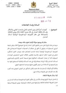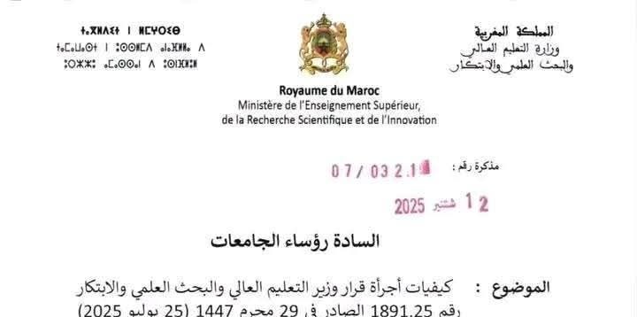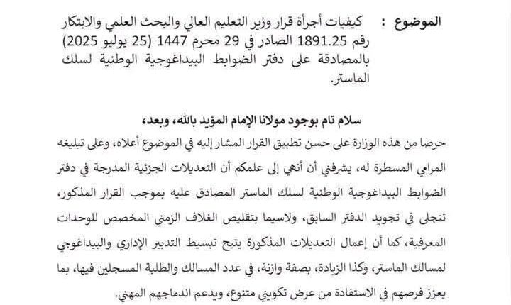 📄 مذكرة وزارية تهم كيفيات أجرأة قرار وزير التعليم العالي والبحث العلمي والابتكار، فيما يتعلق بمسالك الماستر.
