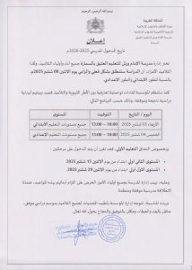 حرصًا منها على تهيئة الأجواء الملائمة للطلبة، ستُقام لقاءات تعريفية تواصلية بين الطاقم التربوي والتلاميذ يومي 3 و4 شتنبر من الساعة 10 صباحًا إلى 1 ظهرًا، لتعزيز التعاون وضمان بداية موفقة.
