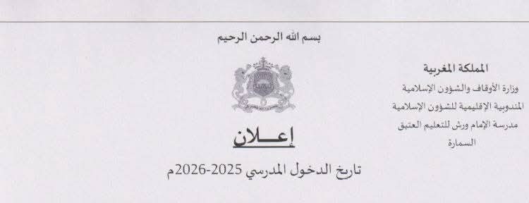 تعلن مدرسة الإمام ورش للتعليم العتيق عن موعد الدخول المدرسي للسنة 2025-2026 بشكل فعلي وإلزامي يوم الاثنين 08 شتنبر 2025م، بالنسبة للطور الإبتدائي والطور الإعدادي.