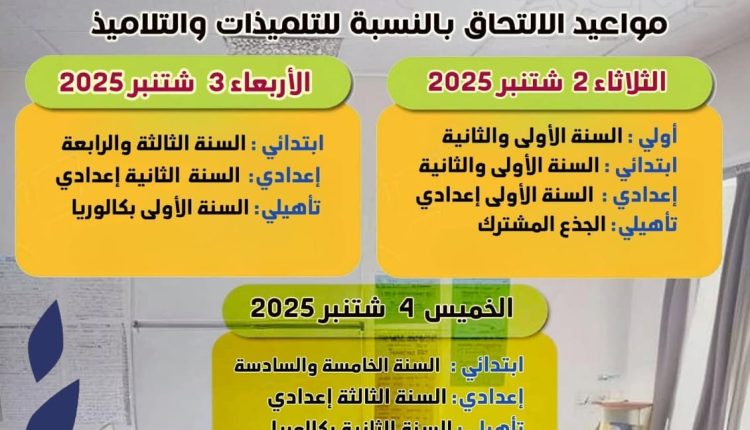 تم تحديد تواريخ التحاق التلميذات والتلاميذ وأطفال التعليم الأولي بالمؤسسات التعليمية وفق الجدولة التالية: