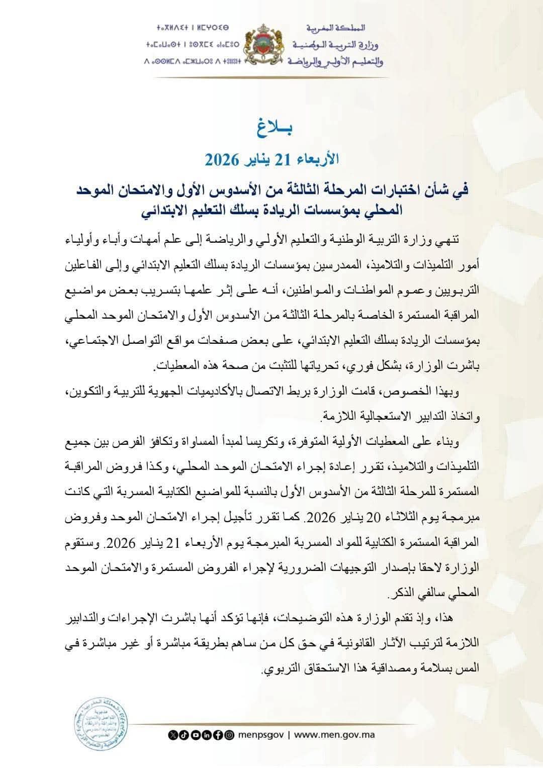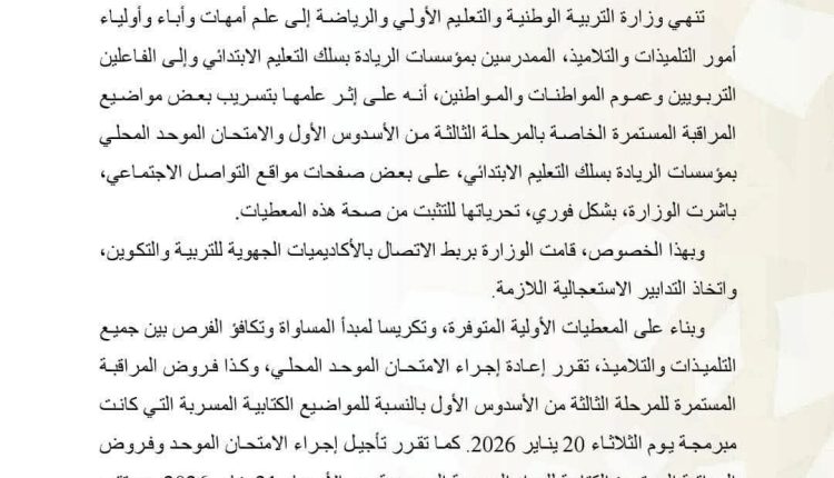 على إثر تداول بعض مواضيع الامتحان بشكل غير قانوني، أعلنت وزارة التربية الوطنية عن قرارها القاضي بإعادة الامتحان الموحد المحلي، وكذا الفروض المتعلقة بالمواد الكتابية التي شملها التسريب، وذلك بسلك التعليم الابتدائي، خاصة بمؤسسات “مدارس الريادة”
