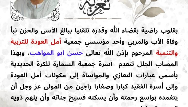 رسالة تعزية ومواساة إلى جمعية أمل العودة للتربية والتنمية في وفاة الاب والمربي وأحد مؤسسي جمعية أمل العودة المرحوم * لحسن أبو المواهب *