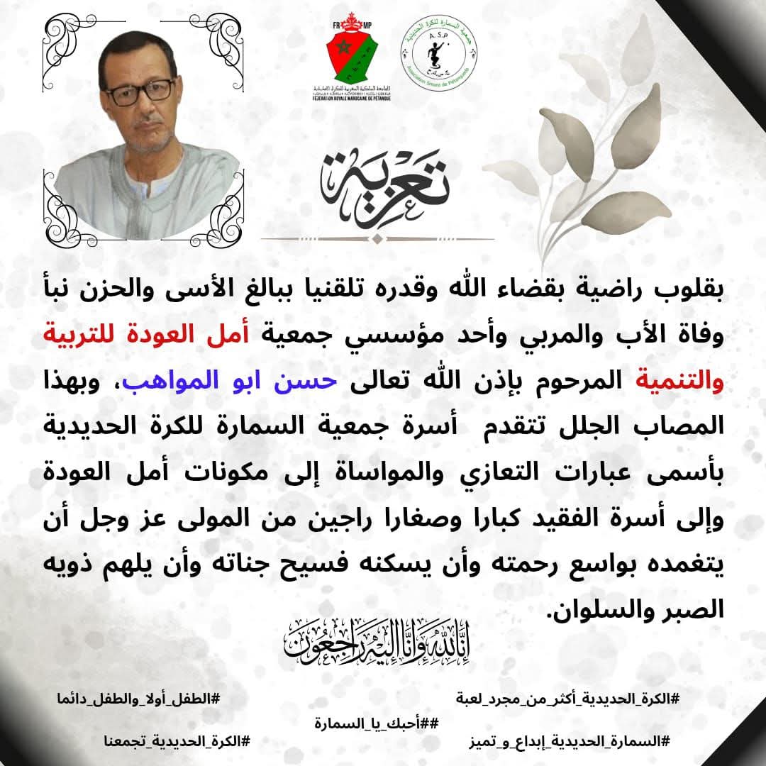 بقلوب راضية بقضاء الله وقدره تلقت مكونات جمعية السمارة للكرة الحديدية نبأ وفاة المشمول برحمة الله تعالى الأب والمربي وأحد مؤسسي جمعية أمل العودة للتربية والتنمية المرحوم *لحسن أبو المواهب *.