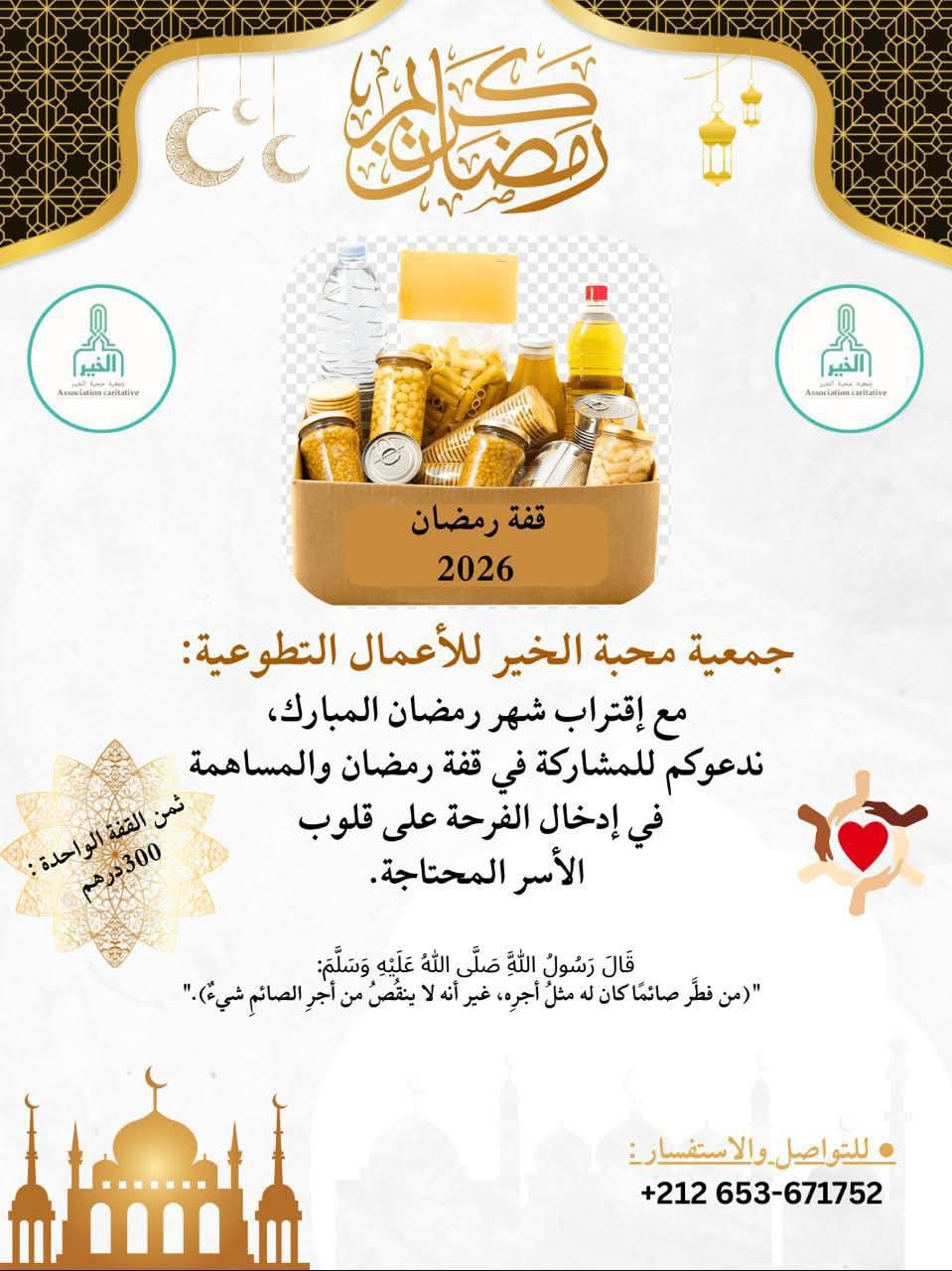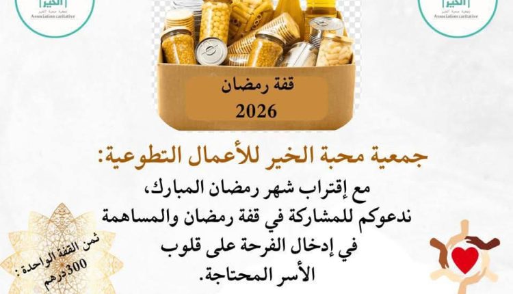 🗣 جمعية محبة الخير للأعمال التطوعية تطلق مبادرة قفة رمضان و تدعو رواد الخير و الإحسان للمشاركة. مجتمع مدني آخر تحديث فبراير 15, 2026 شارك شارك FacebookTwitterWhatsAppPinterestالبريد الإلكترونيطباعة